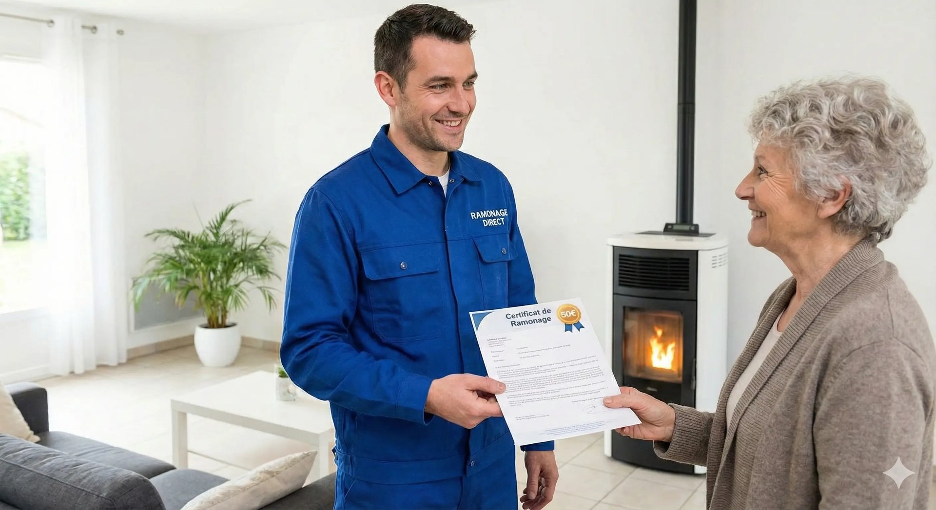 Chez Ramonage Direct, chaque intervention est réalisée par un professionnel qualifié, avec remise immédiate d’un certificat de ramonage officiel.