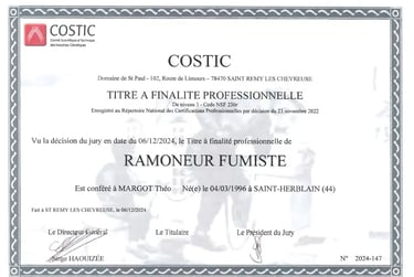Ma certification de "Ramoneur-Fumiste" du COSTIC n'est pas qu'un simple diplôme. C'est la preuve d'une maîtrise approfondie des diagnostics de conduits, de la fumisterie (la science des conduits de fumée), et des normes en vigueur comme le DTU 24.1 et DTU 24.2. Pour vous, c'est l'assurance d'une intervention sûre, efficace et conforme, réalisée par un artisan qui s'engage dans une démarche de formation continue.